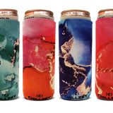 These Chillzey slim can insulator sleeves are made of soft neoprene and help keep your drink cold. Comes in a 4 pack of four different oil print colors. They lay flat so that they can fit in your purse or even back pocket. Stylish design sets the apart from other blank and boring sleeves. Bring along to weddings, bars, social gatherings, and anywhere else a good time breaks out. FITS 12oz slim cans and other skinny drinks. DOES NOT FIT REGULAR SIZE 12oz DRINKS Flat dimensions are 3 1/8" x 6.5" x 1/8"